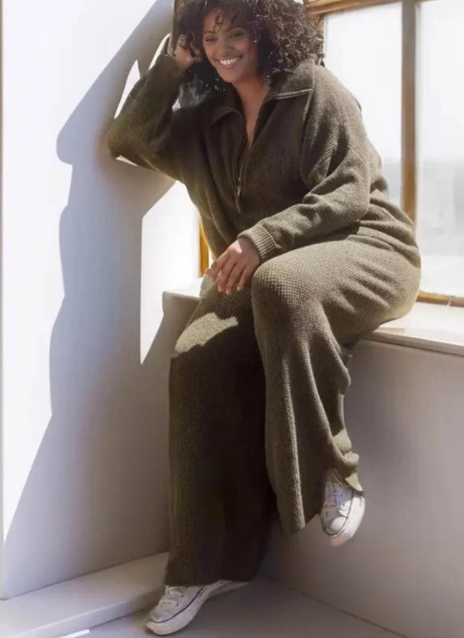 L'ensemble se distingue par sa coupe décontractée et son haut doté d'une fermeture éclair pratique. Le décolleté en V zippé apporte une touche féminine, tandis que la simplicité de la couleur unie ajoute une élégance intemporelle. Idéal pour diverses occasions, cet ensemble vous permettra de rester à la fois confortable et stylée.